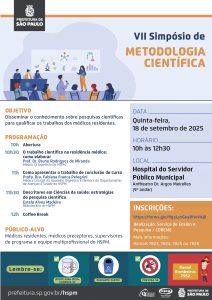 Este ano teremos a 7a. edição do Simpósio de Metodologia Científica, que acontece no segundo semestre, anualmente. Este simpósio de metodologia científica busca aprofundar o conhecimento sobre métodos de pesquisa e aprimorar a produção acadêmica dos médicos residentes. Visa capacitar os pesquisadores, incentivando o pensamento crítico e reflexivo, através do debate interdisciplinar, discutindo a importância dos aspectos éticos da ciência. Ao apresentar tendências, inovações e novas ferramentas metodológicas, favorece a troca de experiências entre pesquisadores de diversas áreas, fortalecendo as redes de pesquisa e colaboração científica.